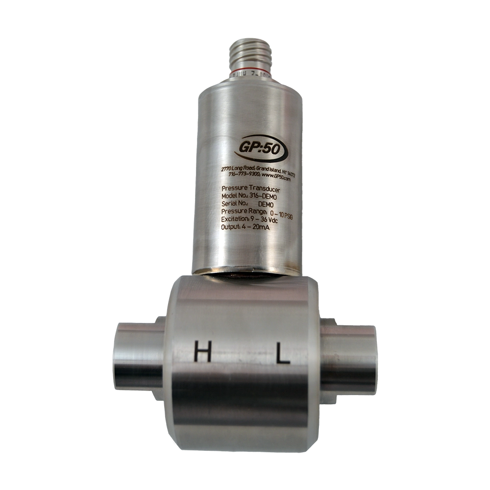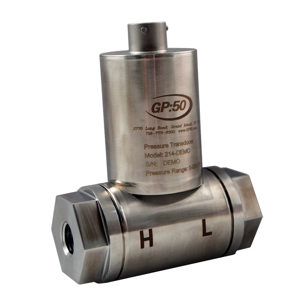 Model 114/214/314 Ultra High Range Differential Pressure Transducer series from GP:50 offers +0.50% (BFSL) static accuracy over its standard ranges of 500 to 20K PSID (35 to 1,379 BAR D). Improved accuracy is available to +0.20%. Their rugged, compact design incorporates a unique, non-filled strain gauge sensing technology. These attributes allow the Model 114/214/314 to effectively support high-cycle pressure measurement requirements, even in space constrained environments. An all stainless steel construction, without seals or o-rings, provides high-corrosion resistance. Optional intrinsically safe versions are also available for extreme applications.