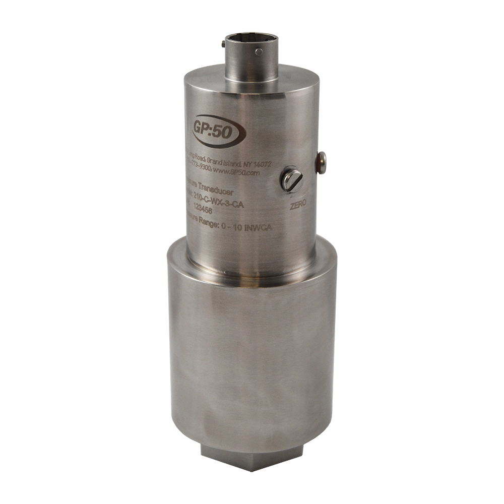 Model 210/310 Low Range Pressure Transducer series from GP:50 provides a high accuracy, low pressure sensor with high proof pressure. With ranges as low as 0 to 5” WC the standard unit provides proof pressures to 500 PSI with an optional ±0.05% FSO static accuracy.