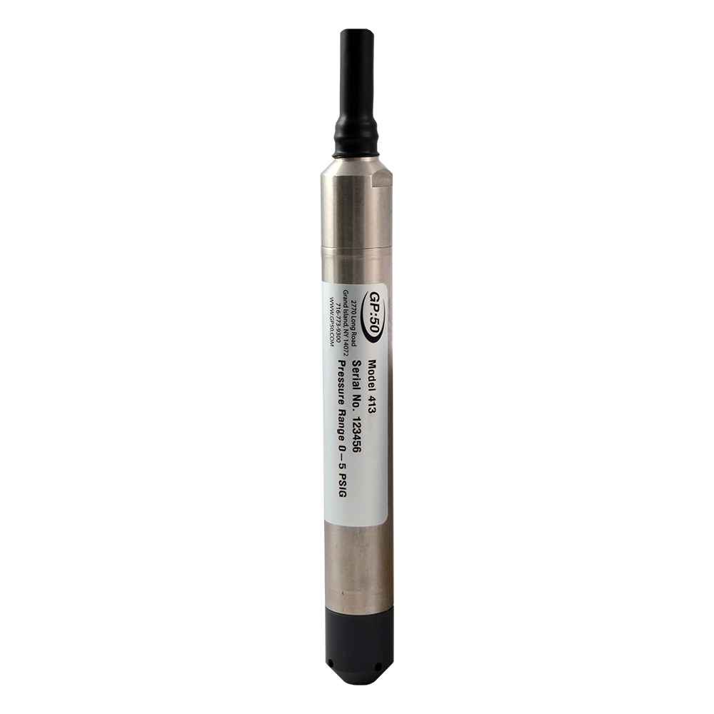 Model 413 Field Rangeable Level Transmitter from GP:50 is a line of field rangeable, highly accurate and reliable submersible level transmitters. The field adjustment option provides for zero and span adjustments as well as rangeability, eliminates the need to rescale your panel meter when replacing transmitters, and allows for fewer units to stock due to rangeability options. The corrosion-resistant 316L stainless steel construction and integrated hydrophobic breather vent help to provide years of maintenance free service life.