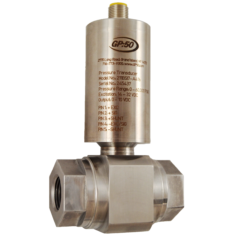 Model 241/341 High Accuracy Pressure Transducer from GP:50 is our most accurate pressure transducer. Designed specifically for aerospace and automotive test stand applications, it is 5x tighter through temperature than standard industrial transmitters with a 0.20% FSO / 100 °F thermal stability. More than 25 years of field expertise went into the design of our pressure transducer for exceptional reliability. The compact, corrosion-resistant, all-welded stainless steel design of the Model 241/341 offers ease of installation within space constrained environments. Static accuracy is available to ±0.05% FSO, with a total thermal error of 0.25% FSO over the compensated temperature range.