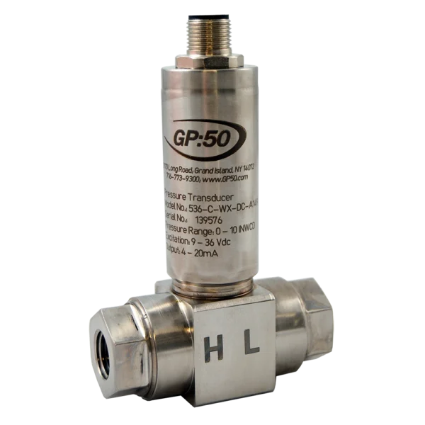 Model 536 CAN Bus from GP:50 is a compact, high-accuracy, digital output differential pressure transducer. This Model measures differential pressure ranges as low as 0-20” WCD (50 mbar) and line pressures up to 1000 PSID (69 BAR) in a compact size with improved thermal performance to meet the demands of the automotive, medical and laboratory test markets. The CAN Open protocol allows for multiple devices on a single bus, reducing installation time and cost.