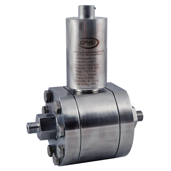 Model 7450 High Line – Low Range Aerospace Differential Pressure Transducer is available with static line pressure to 5,000 PSI. Differential ranges as low as 0-2.5” WCD and a 500 PSI proof pressure are standard on all ranges. A custom subsea rated design allows operation to 23,000 FT SW.